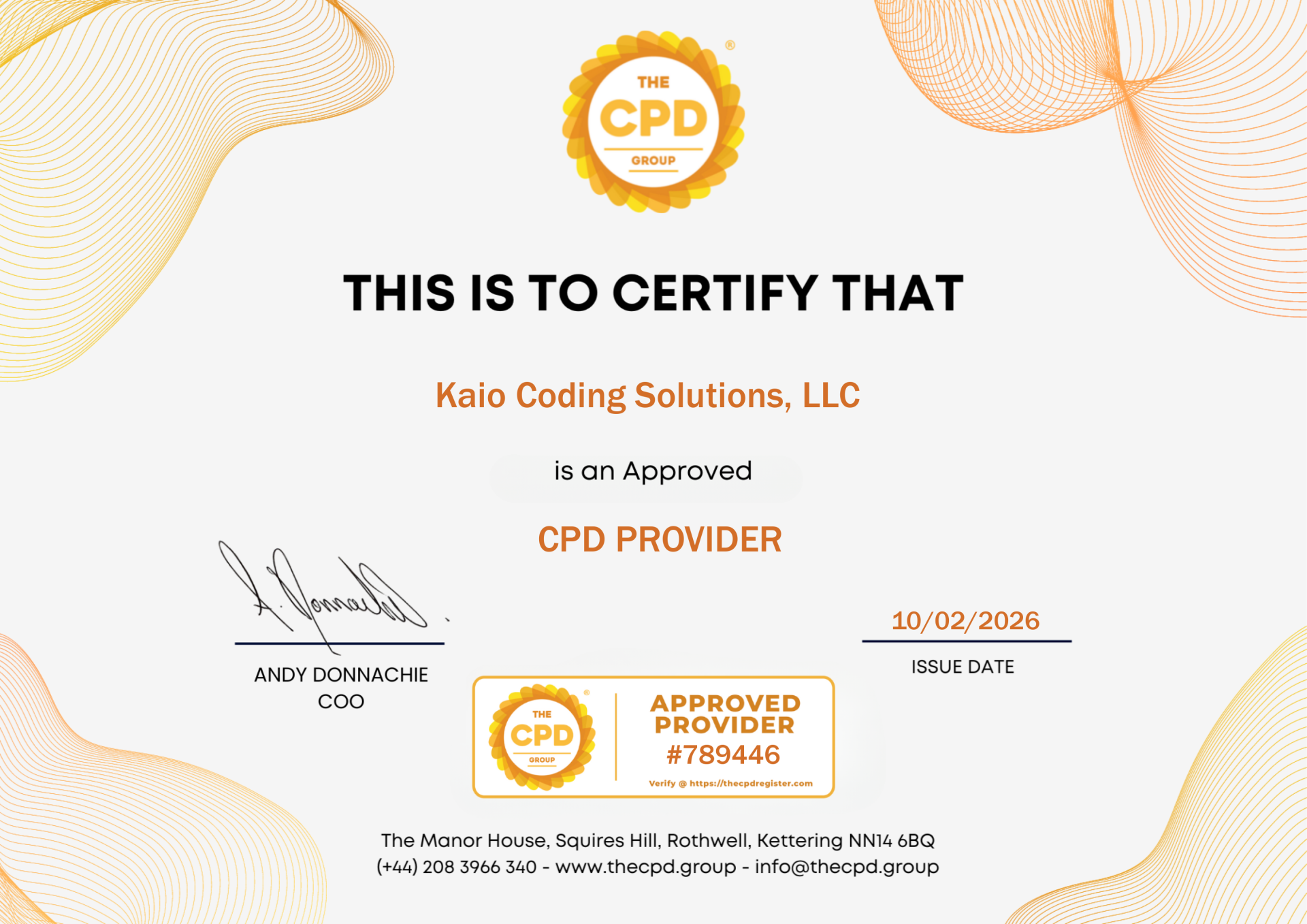 Kaio Coding Solutions is a CPD Approved Provider, recognized for delivering structured learning activities that meet established continuing professional development standards.